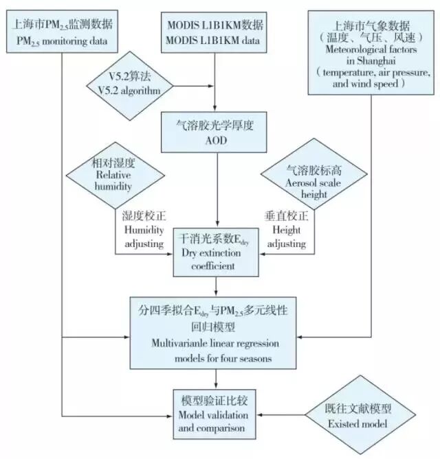 利用美国航空航天局免费提供的中分辨率成像光谱仪 ( MODIS)L1B1KM卫星遥感数据反演上海市的AOD。 对AOD进行垂直和湿度校正后,生成干消光系数Edry,引入日均气压、日均风速、日均温度等影响气溶胶扩散的气象因素,拟合由Edry估算近地面空气PM2.5浓度的模型。利用地面实测PM2.5浓度对模型进行验证,并与已有模型进行比较评价,研究思路见下图。