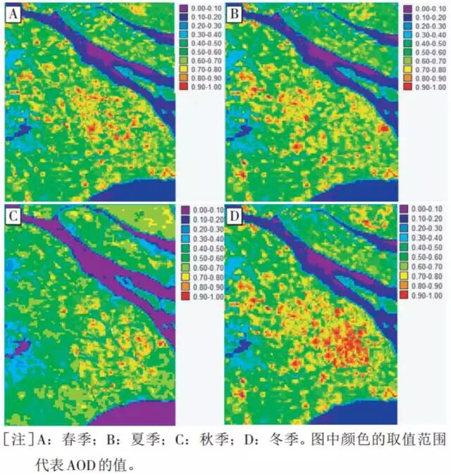 上海不同季节AOD反演结果均值分别为:春季0.57,夏季0.48,秋季0.41,冬季0.72,年平均值0.53。