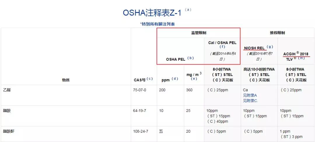 为了向用人单位,工人和其他利益相关方提供可能有助于更好地保护工人的替代职业接触限值清单,OSHA已经在现有的Z-Tables中注明了其他选定的职业接触限值。并排列出(见下图),最新的ACGIH已更新。该推荐的NIOSH暴露极限(的RELs)和ACGIH ®的TLV ®秒。表格列出了空气浓度限值,但不包括皮肤吸收或致敏的注释。