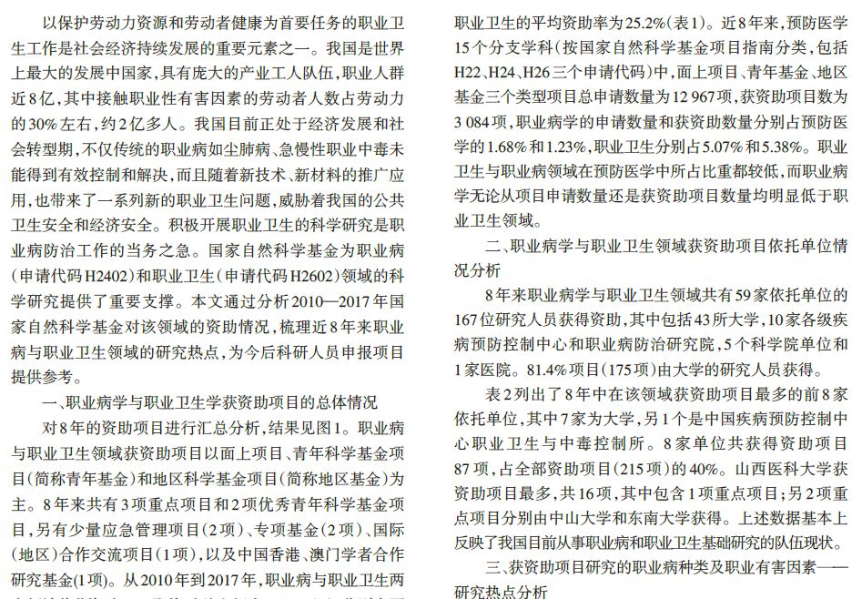《2010—2017 年职业卫生与职业病领域国家自然科学基金资助项目分析》一文。