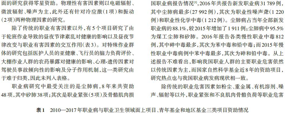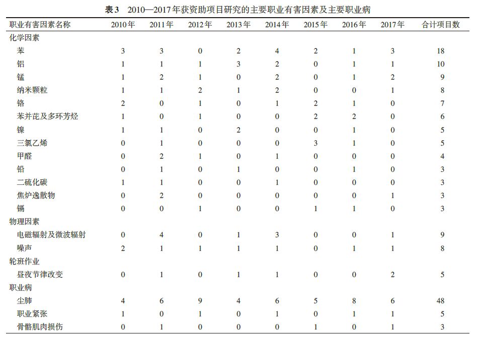 上表列举了2010—2017年国家自然科学基金获资助项目研究较多的职业有害因素和主要职业病种类。
