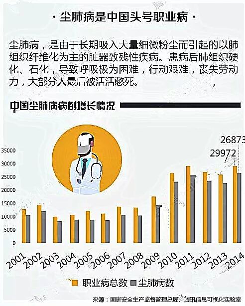 根据全国31个省、自治区、直辖市和新疆生产建设兵团报告,2015年共报告职业病29180例。从病种分布看,职业性尘肺病为26081例;2016年共报告职业病31789例。其中,职业性尘肺病及其他呼吸系统疾病28088例,依然是尘肺病所占比例多。