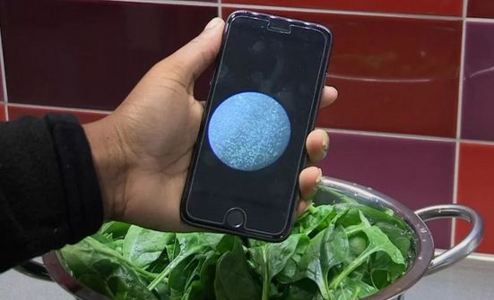 检测者只需收集水,果汁或捣碎的蔬菜叶样品,并将检测芯片放入样品中,用高pH缓冲液洗去食物中的化合物成分,只留下细菌,然后用智能手机显微镜和应用软件即可视化检测含有芯片样本中的细菌含量。