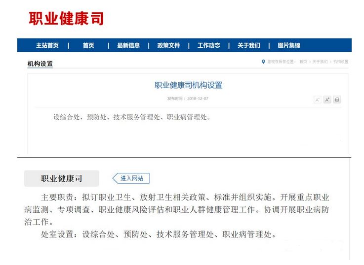 职业健康司设 综合处、预防处、技术服务管理处、职业病管理处。